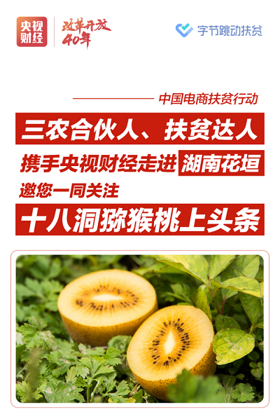字节跳动扶贫与“黑土麦田公益”驻花垣县十八洞村的青年队员合作,依托今日头条、西瓜视频、抖音短视频、火山小视频等平台,帮助当地村民打造猕猴桃的品牌,包装并售卖,助力十八洞猕猴桃产业发展。上市26天,累计卖出猕猴桃6万6千单,共计118万多颗,惠及当地2000多户建档立卡贫困户。