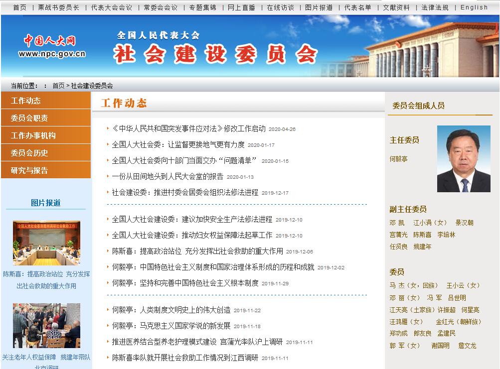 目前,全国人大社会建设委员会主任委员为何毅亭,副主任委员共8位,分别是邓凯、江小涓、景汉朝、宫蒲光、陈斯喜、李培林、任贤良、姚建年。