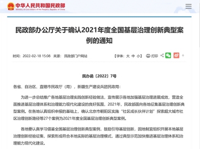 为进一步总结推广各地基层治理实践创新经验做法,宣传展示各地加强基层治理进展成效,营造全面推进基层治理体系和治理能力现代化建设的良好氛围,2021年,民政部面向各地征集基层治理创新典型案例。在各地认真组织申报的基础上,确认北京市朝阳区实施“社区成长伙伴计划”探索超大城市社区治理创新路径等27个案例为2021年度全国基层治理创新典型案例。