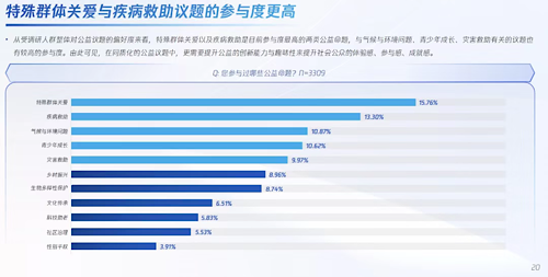 当前,特殊群体关爱、疾病救助是公众参与度最高的两类公益议题,而文化传承、科技助老、社区治理、性别平权等公益议题就显得较为缺位。《报告》发现,小众议题在受调研人群中期待值更高;数字化技术让一些平时社会关注度较小的社会议题走入大众视野,让多元力量共同参与探寻解决方案。