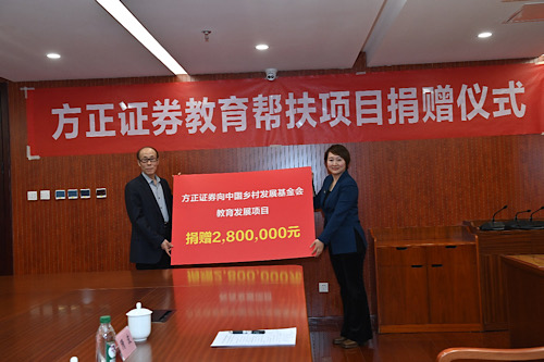 1月18日,方正证券教育帮扶项目捐赠仪式在京举行。中国乡村发展基金会理事长郑文凯,教育部学生服务与素质发展中心党委书记、主任刘玉光,中国证券业协会会员管理部中级主办王阿迪,方正证券股份有限公司副总裁、湖南方正证券汇爱公益基金会理事长熊郁柳出席活动,来自湖南省安化县、江西省石城县、河南省新县及桐柏县、云南省弥渡县的32位项目代表线上参会。