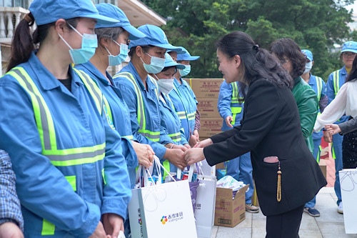 广州市妇联党组书记、主席龚红,黄埔区人大常委会党组成员、黄埔区二级巡视员牛穗生,黄埔区妇联党组书记、主席王晓虹,黄埔区城管局党组成员、副局长周璟,香雪制药党委书记朱学艺,广东省岭南教育慈善基金会秘书长何淑莹,黄埔区环卫美化服务中心主任李宗英,黄埔区环卫美化服务中心工会主席余东方等共同出席了捐赠仪式,并在活动现场亲手将慰问礼品送到工作人员手中,送上新春的祝福。