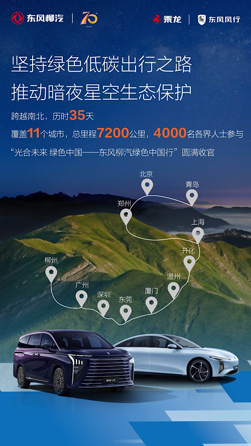 建厂70周年之际,东风柳汽将紧随东风集团“三个跃迁、一个向新”战略,全面推进“新能源化、智能化、国际化”转型跃升。征程万里风正劲,重任千钧再出发。东风柳汽绿色中国行公益圆满收官,为美丽中国添彩。未来,东风柳汽将坚持自研创新之路,勇担民族工业振兴使命,在汽车强国建设中冲锋在前,为中国汽车产业迈向高质量发展贡献坚实力量。